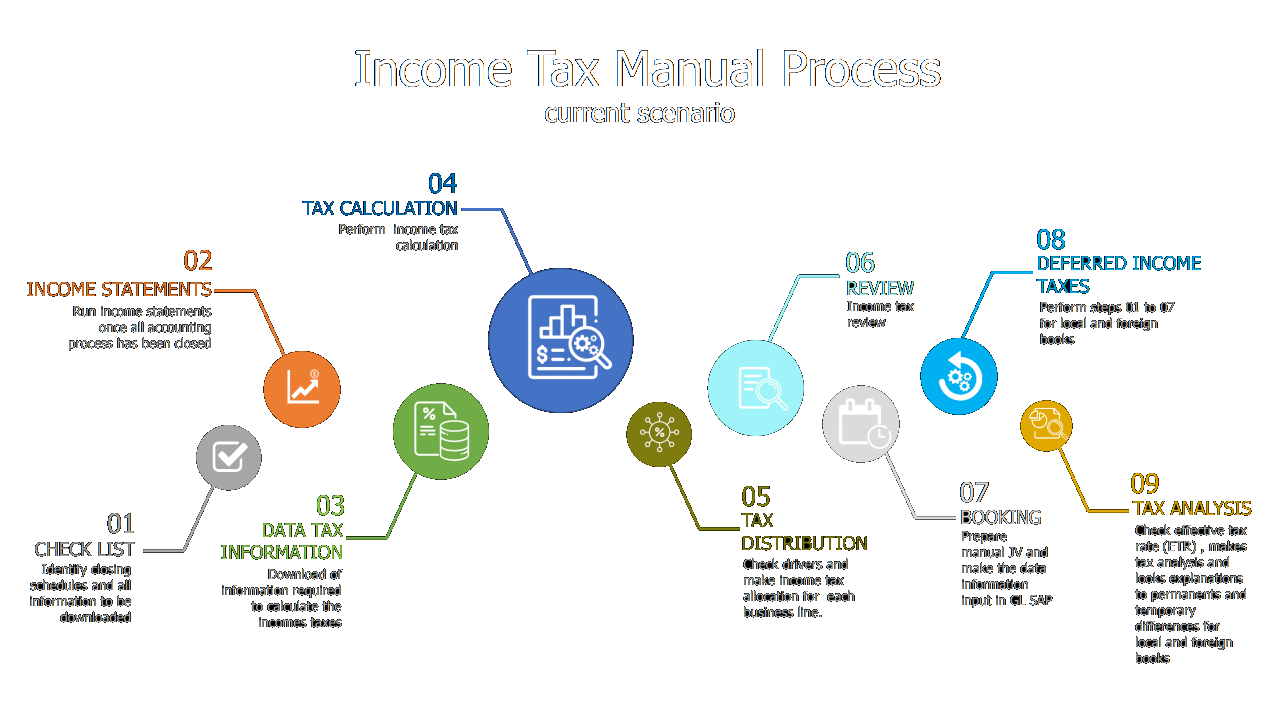 Income Tax information and Effective Tax Rate (ETR) are available by company, profit center, cost center, geographical area, and account. This information will help you identify and resolve potential issues before closing your financial statements and filing your Income Tax, avoiding Income Tax over/under accruals/payments and fines.